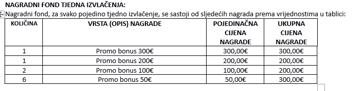 • Nagradni fond se sastoji od nagrada navedenih u tabeli. Nagradni fond za svako pojedino tjedno izvlačenje iznosi 1.000€ u promo bonusima za igru na aparatima za igre na sreću.