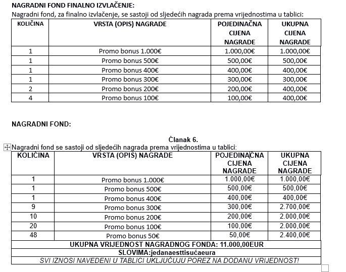 • Nagradni fond se sastoji od nagrada navedenih u tabeli. Nagradni fond za finalno izvlačenje iznosi 3.000€ u promo bonusima za igru na aparatima za igre na sreću.
