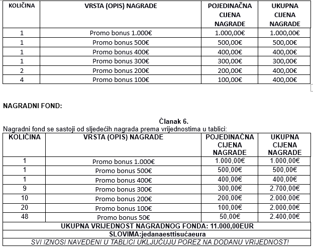 • Nagradni fond se sastoji od nagrada navedenih u tabeli. Nagradni fond za finalno izvlačenje iznosi 3.000€ u promo bonusima za igru na aparatima za igre na sreću.